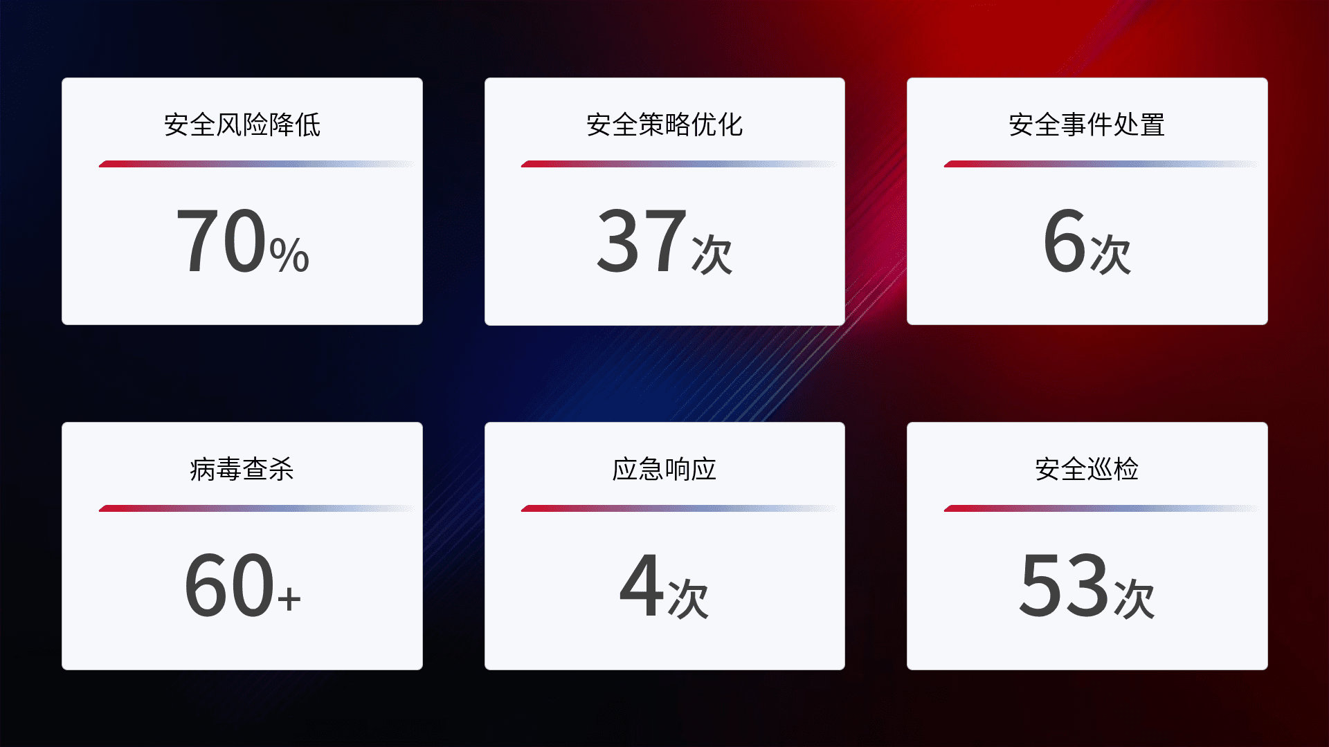 提供全面的安全事件报告体系,,,包括处置报告、、、、周报、、、、季度和年度总结,,,,结合持续监控,,,,帮助客户深入了解网络安全状况。。。